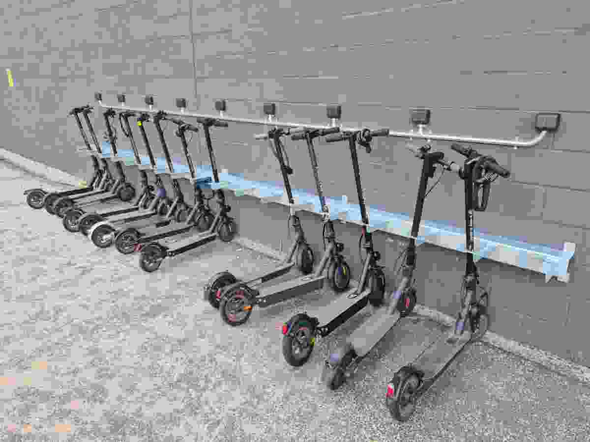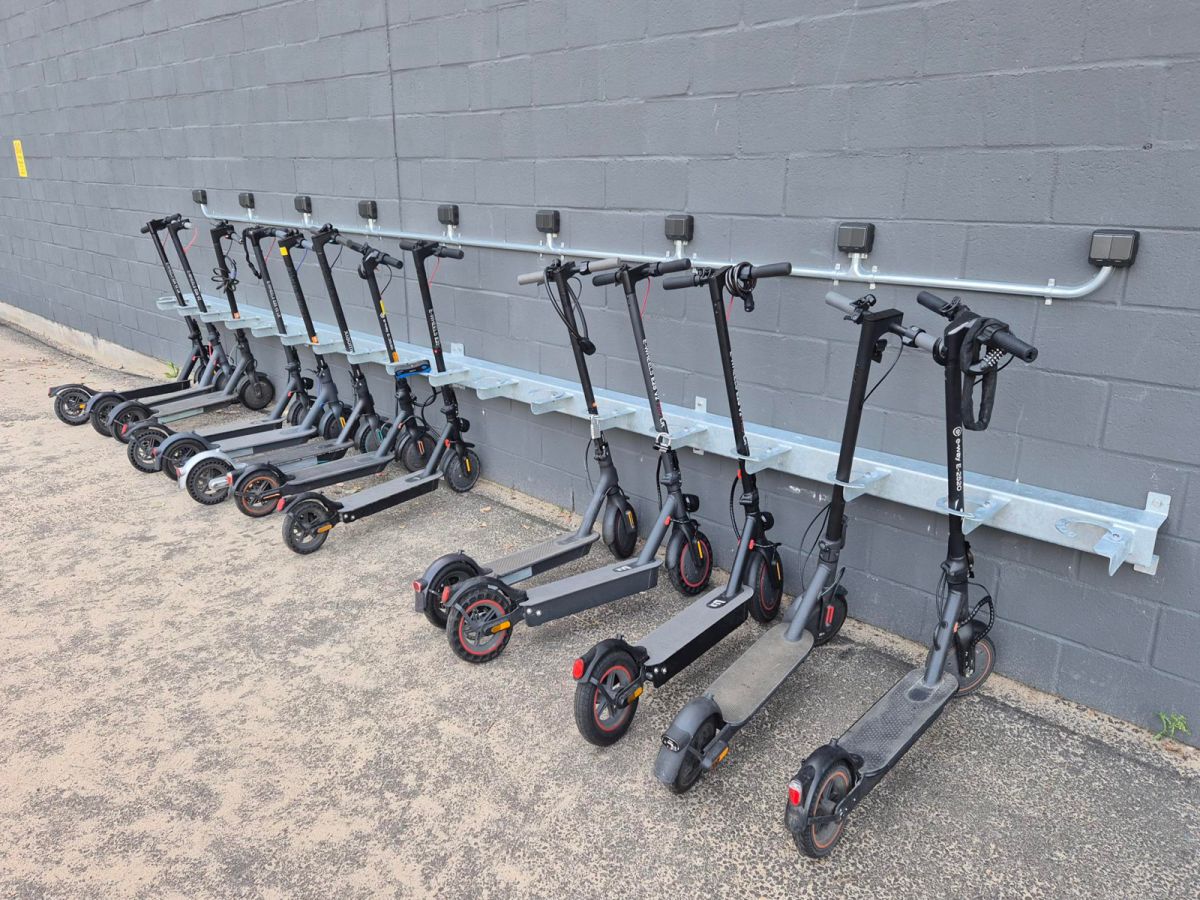 Vid ena träningshallen finns sedan september ett ställ med 18 platser för elsparkcyklar, där besökare kan parkera och under tiden ladda batteriet. Det är viktigt att ta med eget hänglås för att säkra scootern. Inom kort sätter vi upp ett tak upp för att ge väderskydd.