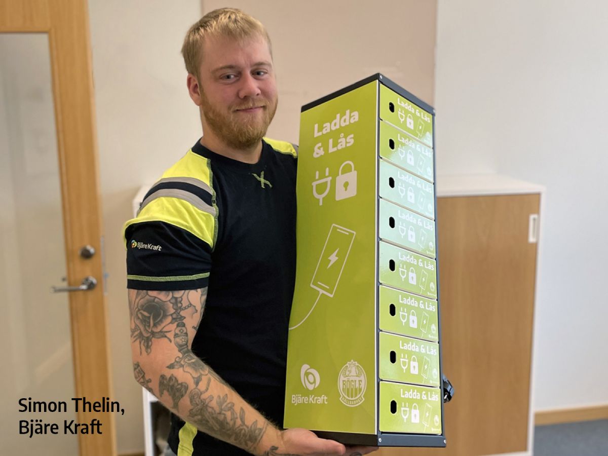 Sedan september finns även skåp för mobiltelefoner med plats för upp till 24 laddande enheter samtidigt. Även här tar man med eget hänglås. Elen för både mobiler och elsparkcyklar är kostnadsfri – den bjuder Bjäre Kraft på.
