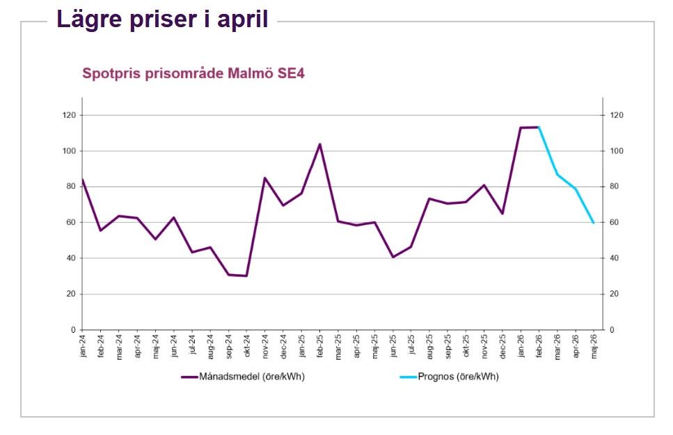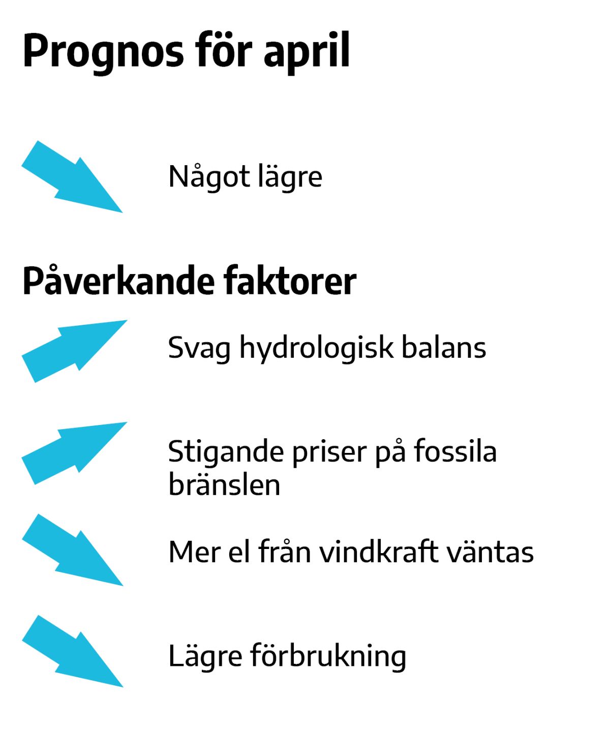 Den hydrologiska balansen är fortsatt svag med ett underskott på omkring 25 TWh. Underskottet finns främst i snö och grundvatten, vilket gör att vårfloden väntas bli mindre än normalt när den startar i slutet av april eller början av maj. Samtidigt är priserna på fossila bränslen fortsatt höga. När förnybar produktion inte räcker till påverkas elpriset snabbt. Det gör att vi även framöver kan få stora prisskillnader under dygnet, med höga pristoppar vissa timmar och låga priser när solen skiner eller vinden blåser ordentligt.
