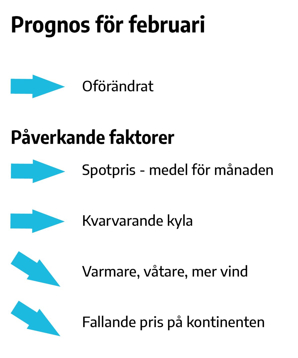 Eftersom början av februari var dyr väntas snittpriset för månaden hamna ungefär i samma nivå som i januari. Trots det blir elräkningen lägre för många, helt enkelt för att februari bara har 28 dagar, tre färre än januari.