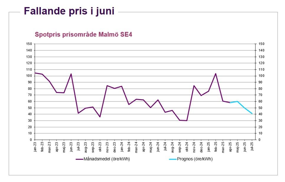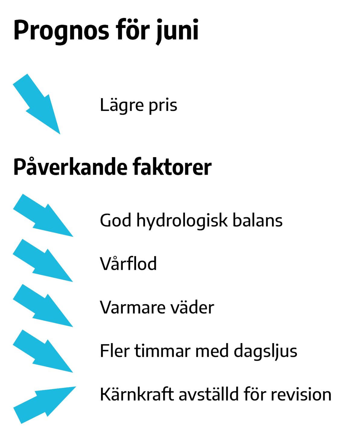 Framöver väntas spotpriset fortsätta sjunka, särskilt i norra Sverige. Det beror på att vattenkraftsmagasinen är ovanligt välfyllda för årstiden, samtidigt som både vind- och solkraften fortsätter att byggas ut.